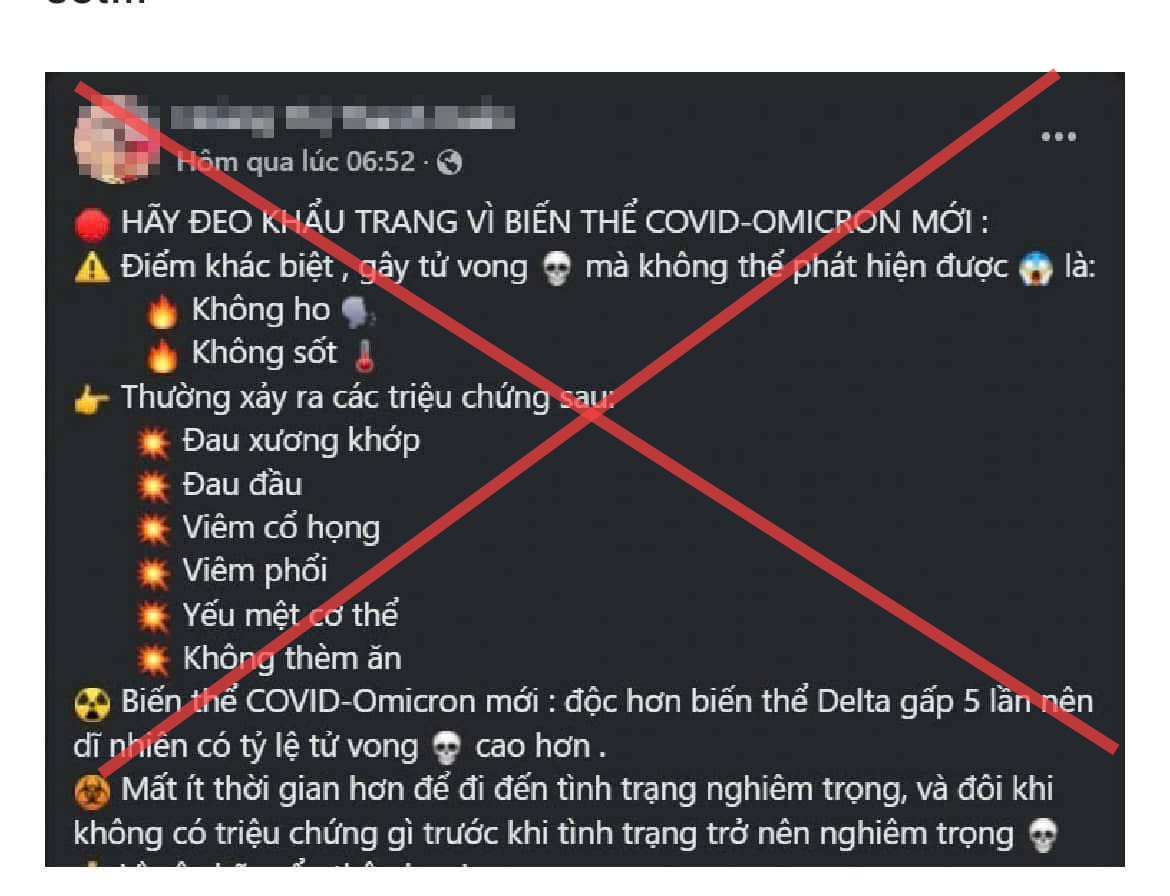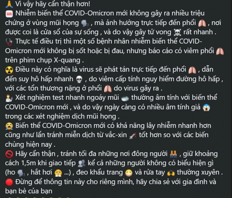 Cụ thể, các bài đăng này chia sẻ cùng một nội dung, đó là: "Biến thể COVID-Omicron mới có khả năng lây nhiễm nhanh hơn cũng như lẩn tránh miễn dịch từ vaccine tốt hơn so với các biến chủng hiện nay. Điểm khác biệt, gây tử vong mà không thể phát hiện được là không ho, không sốt...